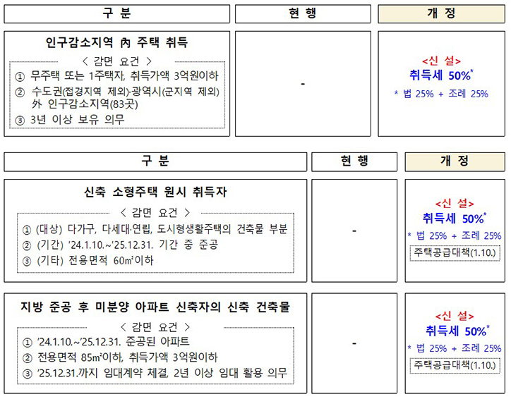 비수도권 지역에 소재한 준공 후 미분양된 아파트를 임대주택으로 활용하는 경우도 신축 취득세를 최대 50%(법 25%+조례 25%)까지 감면받도록 해 지방의 주택 미분양 문제 해소를 지원한다고 합니다.