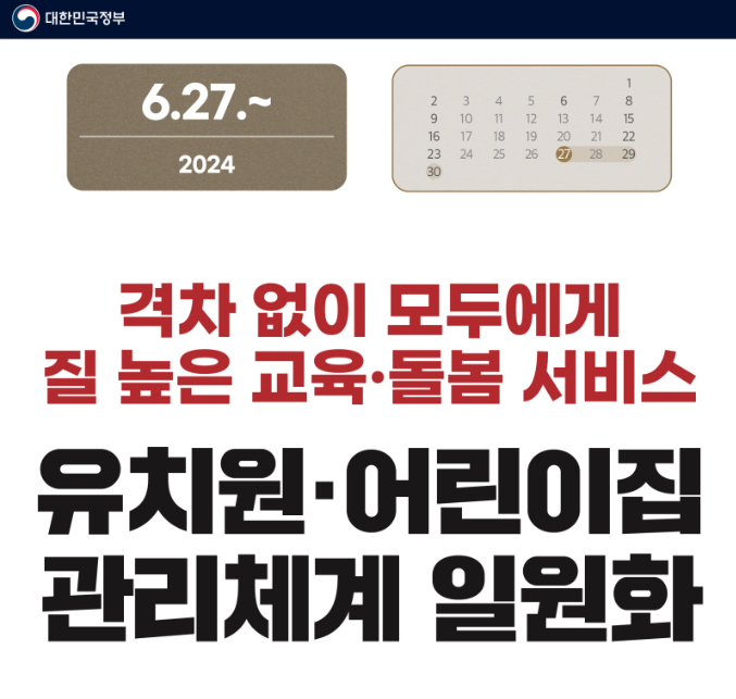 6월 27일부터 유치원과 어린이집의 관리체계를 교육부로 일원화합니다.