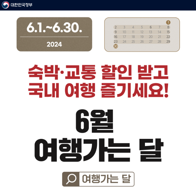 6월 1일부터 30일까지 국내 숙박·교통·여행상품 할인혜택을 드립니다.
