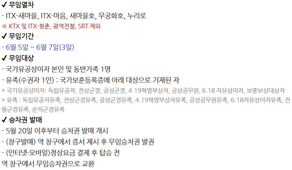 - 전화 또는 인터넷 예약 후 매표 또는 탑승 시 국가유공자증(유족증) 및 동반보호자 신분증 제시