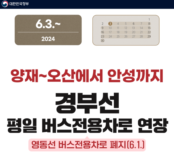 6월 3일부터 경부선 평일 버스전용차로를 양재~오산에서 안성까지 연장합니다.