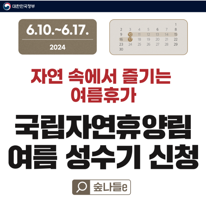 6월 10일 오전 9시부터 17일 오후 6시까지 전국의 국립자연휴양림의 여름 성수기 추첨 신청기간입니다.