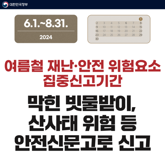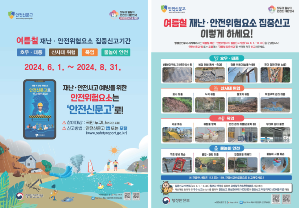 6월 1일부터 8월 31일까지 여름철 재난·안전 위험 요소 집중신고기간입니다.