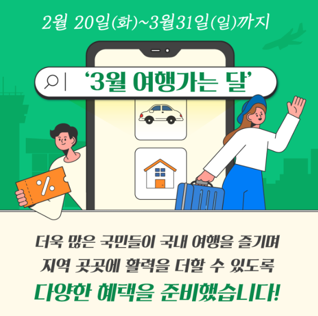 2월 20일(화)~3월 31일(일)까지 더욱 많은 국민들이 국내 여행을 즐기며 지역 곳곳에 활력을 더할 수 있도록 '3월 여행가는 달' 다양한 혜택을 준비했다고 합니다.