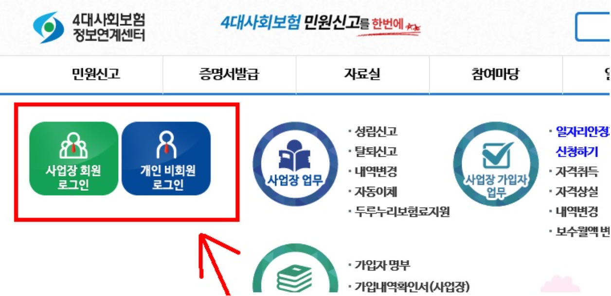 '4대 사회보험 정보연계센터'는 4대보험과 관련된 업무를 종합적으로 처리할 수 있는 사이트라고 합니다. 여기는 사업장 적용/변경/탈퇴, 근로자 취득/상실, 4대보험증명서 발급 등을 비대면으로 할 수 있는 곳이라고 합니다.