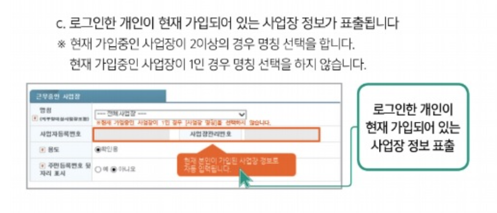 c. 사업장 명칭, 사업자등록번호, 사업장 관리번호 자동 표출