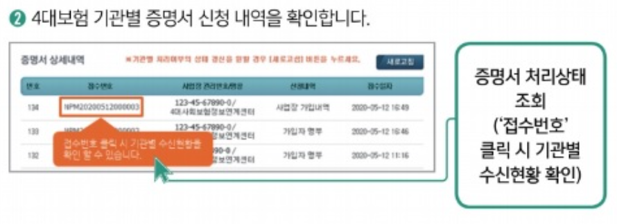 접수번호를 클릭했을 때 4대보험 모두 '처리완료'로 조회되며 발급이 가능한 상태가 된다고 합니다.(일부가 처리중인 경우, 새로고침을 누르며 기다리면 된다고 합니다.