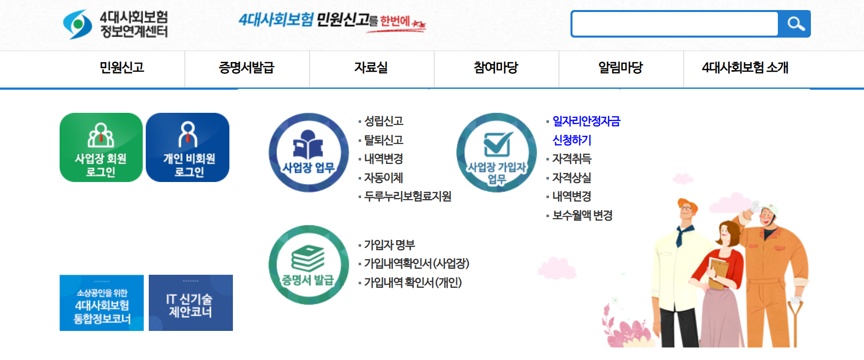 '4대 사회보험 정보연계센터'는 4대보험과 관련된 업무를 종합적으로 처리할 수 있는 사이트라고 합니다. 여기는 사업장 적용/변경/탈퇴, 근로자 취득/상실, 4대보험증명서 발급 등을 비대면으로 할 수 있는 곳이라고 합니다.