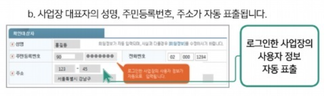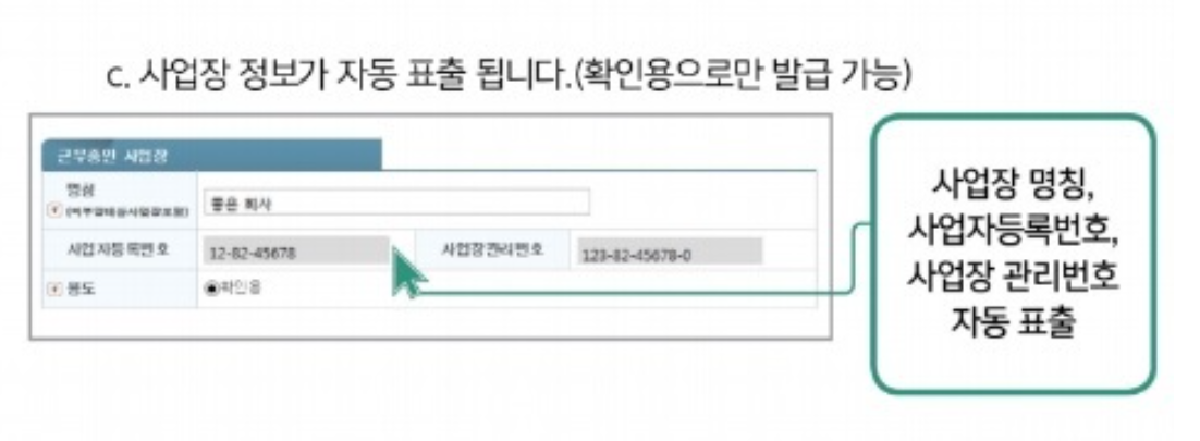 c. 사업장 명칭, 사업자등록번호, 사업장 관리번호 자동 표출