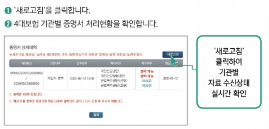 접수번호를 클릭했을 때 4대보험 모두 '처리완료'로 조회되며 발급이 가능한 상태가 된다고 합니다.(일부가 처리중인 경우, 새로고침을 누르며 기다리면 된다고 합니다.