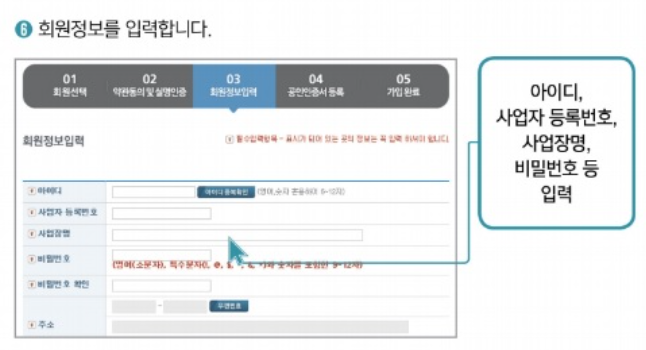 ③ 아이디, 사업자 등록번호, 사업장명, 비밀번호 등 입력