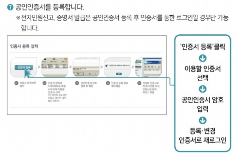 ⑤ 인증서 등록 클릭 ▶ 이용할 인증서 선택 ▶ 공인인증서 암호 입력 ▶ 등록·변경 인증서로 재로그인