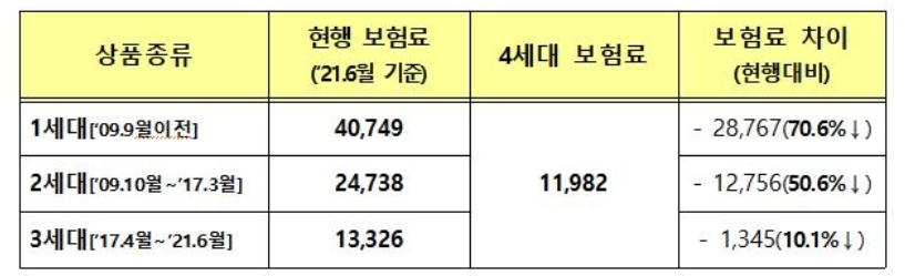 4세대 상품 보험료는 1세대(2009년 9월 판매)에 비하면 약 70%, 2세대(2009년 10월~2017년 3월) 대비 약 50%, 3세대(2017년 4월~2021년 6월) 대비 약 10% 싼 것으로 나타났다고 합니다.