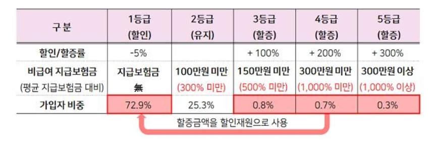 즉, 1년간 비급여 보험금 지급액이 없으면 보험료가 할이되지만, 100만원 미만이면 2단계로 기존 보험금유지, 3단계(100만원~150만원)면 100% 할증, 4단계(150만~300만원)외 5단계(300만원 이상)는 각각 200%, 300% 할증이 되는 구조라고 합니다.