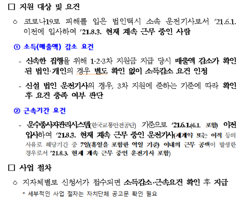 지원 대상은 코로나19로 매출이 감소한 택시법인에 소속된 운전기사 또는 본인의 소득이 감소한 운전기사로서 2021년 6월 1일 이전(6월 1일 포함)에 입사하여 2021년 8월 3일 현재까지 계속 근무해야 한다고 합니다.