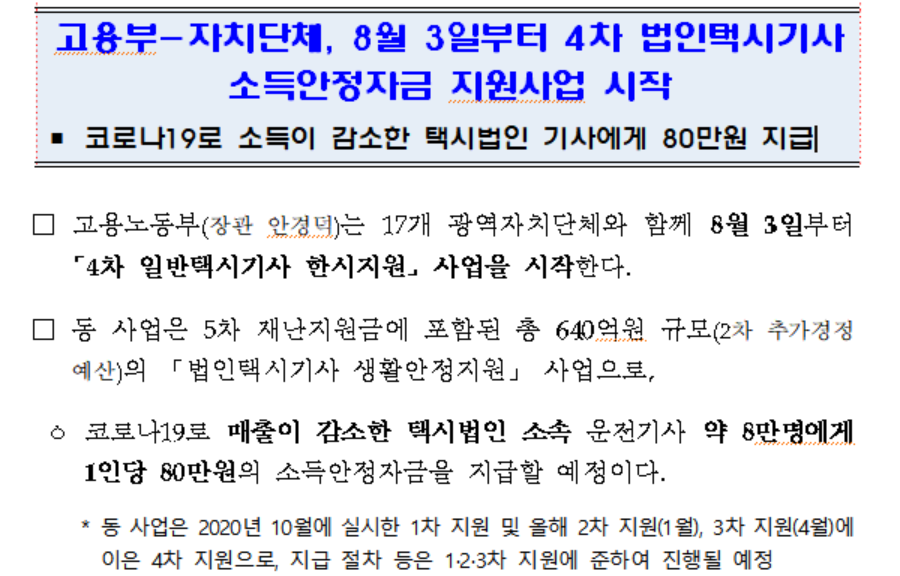 고용부-자치단체, 8월 3일부터 4차 법인택시기사 소득안정자금 지원사업 시작 - 보도자료 | 브리핑룸 | 뉴스 | 대한민국 정책브리핑 (korea.kr)