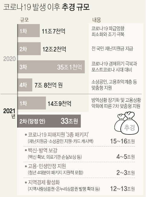 이는 백신 방역 보강에 약 4조 이상, 고용 및 민생안정 지원에 2조원에서 3조원 지역경제 활성화와 지방재정보강 등에 12조 이상을 편성하기로 했다고 합니다.