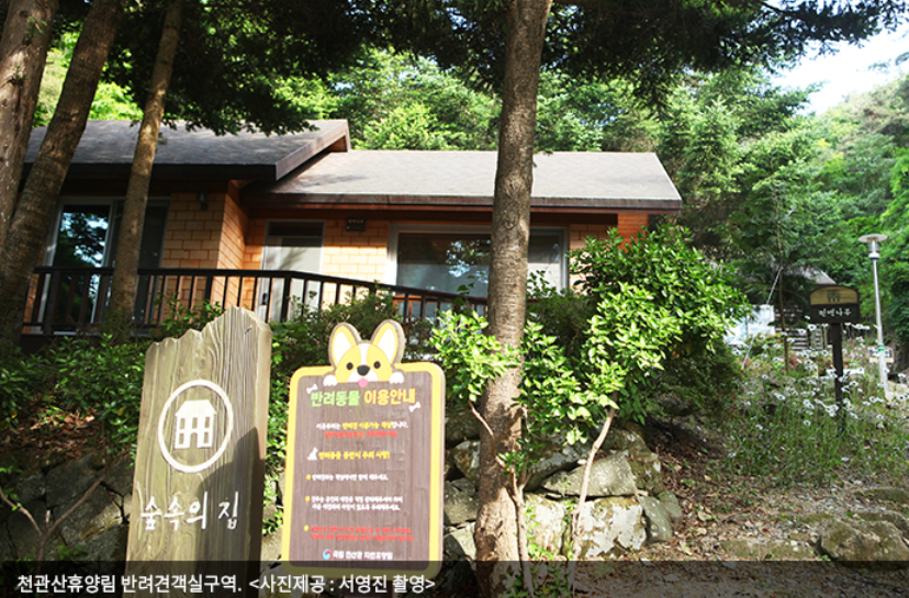 장흥 국립천관산자연휴양림은 반려견과 숲속에서 머무는 달콤한 하룻밤이 가능하다. 호남 일대에서 유일하게 반려견 동반 숙박이 허용되는 국립자연휴양림이다. 진입로에 동백나무 숲이 울창하며, 반려견 동반 객실은 매표소 지나 휴양림 끝자락에 있다. 반려견 객실은 숲속의 집 1실과 연립동 2실이며, 숙소 뒤쪽으로 반려견 산책로와 전용 놀이터를 조성해 올 하반기 중 문을 열 계획이다.