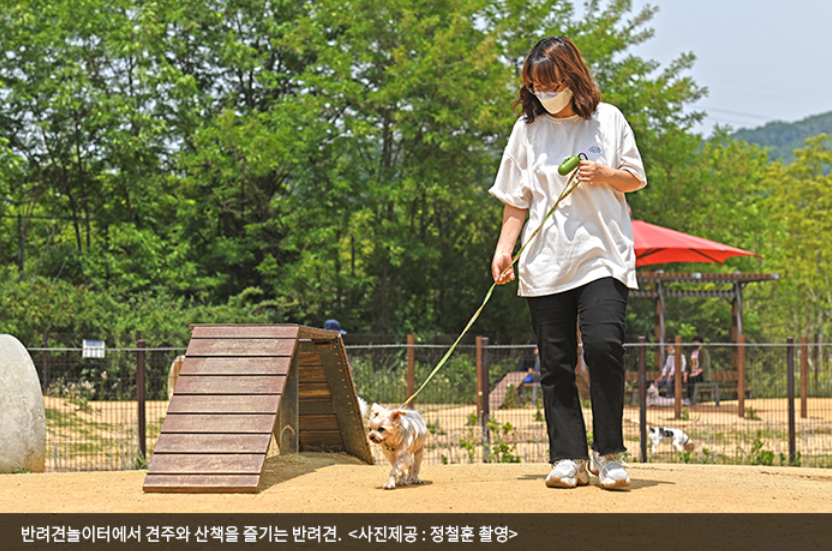 2018년 개장한 이곳은 축구장 절반쯤 되는 3524㎡ 규모다. 이 가운데 반을 소형견, 나머지 반을 중·대형견을 위한 놀이터로 운영한다. 동물 등록을 하지 않았거나 도사견, 아메리칸핏불테리어, 아메리칸스태퍼드셔테리어 같은 맹견은 입장이 불가하다. 인천대공원은 모든 공간에서 반려견과 함께할 수 있다. 견주가 반려견놀이터 다음으로 많이 찾는 곳이 시민의 숲이다. 소형 그늘막 텐트 설치가 허용돼서 반려견과 캠핑하듯 여유로운 시간을 보내기 좋다.