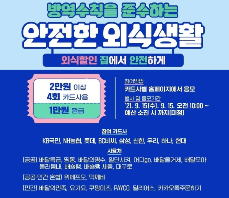 배달 외식 할인 지원사업에 참여하는 카드사는 KB국민, NH농협, 비씨, 롯데, 우리, 삼성, 신한, 하나, 현대 9곳이라고 합니다.