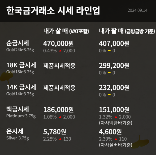 9월 14일 기준 순금시세는 전날 대비 2,000원 상승한 470,000원이며 백금시세도 전날 대비 2,000원 상승한 186,000원입니다. 그리고 은시세는 전날 대비 130원 상승한 5,780원이라고 합니다.