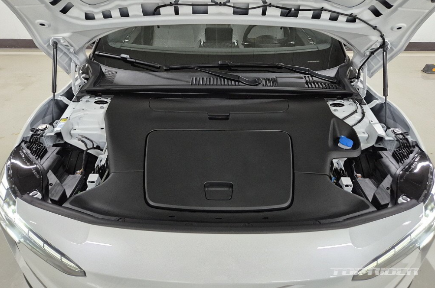 측면에서는 뒤로 갈수록 낮아지는 공기역학을 고려한 루프 실루엣을 블랙컬러 마감으로 숨겼습니다. 배터리팩 수용으로 넓어진 측면 면적은 하단을 블랙 마감해 둔한 모습을 줄였습니다. 통으로 조절되는 프레임리스 사이드미러는 폴스타의 그것과 유사합니다. 충전구는 전통적인 주유구 위치입니다.