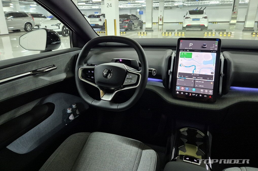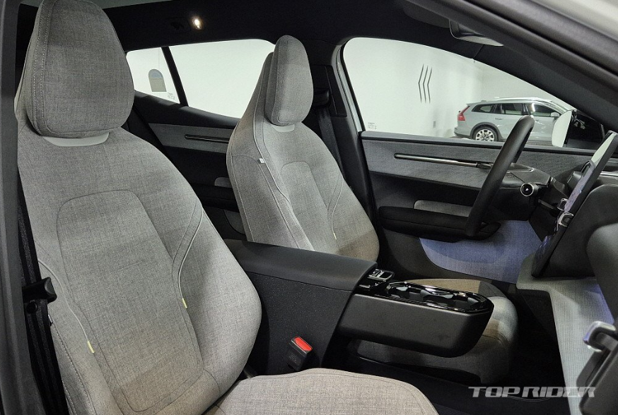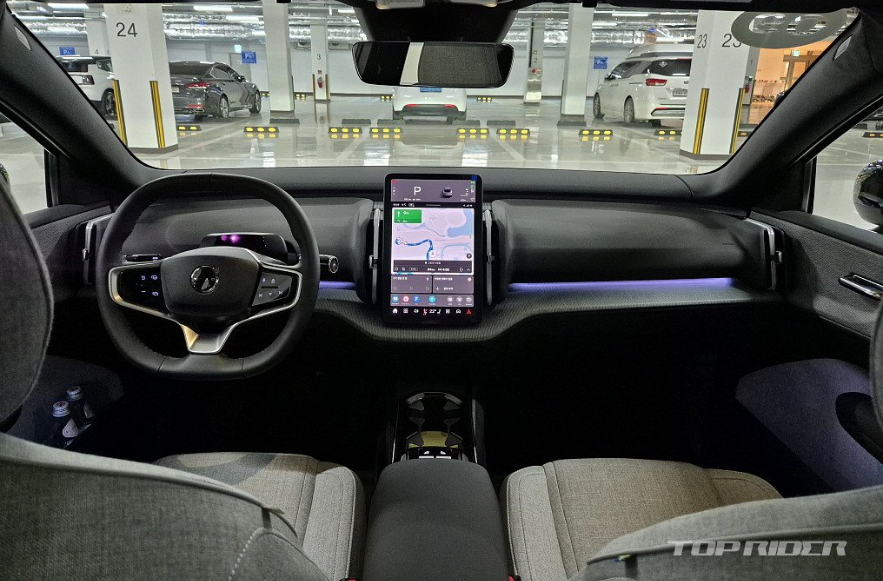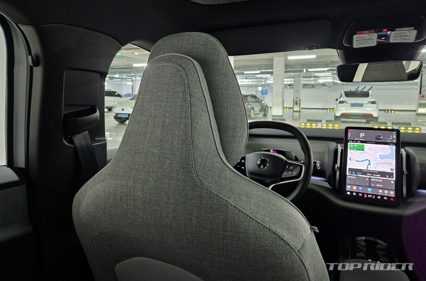 운전석에서의 시트포지션은 안정적입니다. 전기차 전용 설계가 적용된 만큼 바닥만 높게 올라온 내연기관차 겸용 전기차는 다른 느낌입니다. 시트는 네모난 하나의 레버로 모든 조작이 가능한데, 의외로 직관적입니다. 플라스틱과 패브릭이 혼재된 실내는 친환경 소재 구성 중 가장 만족스럽습니다.