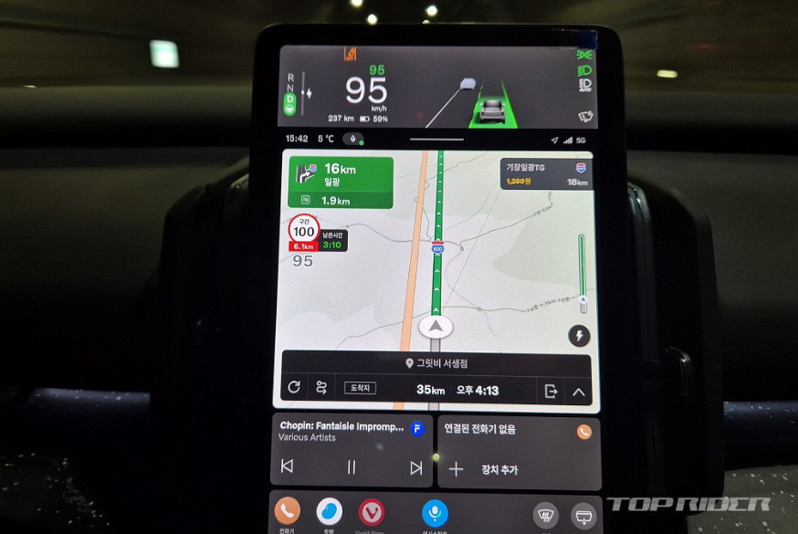 회생제동은 비교적 약하게 잡히는 설정으로 편안함이 강조됐습니다. 오히려 항속시 속도를 유지하려는 성향이 있습니다. 강한 브레이킹이 반복되는 상황에는 회생제동량을 늘릴 필요가 있겠습니다. 고속주행 시 전력 소비량의 증가는 비교적 안정적입니다. 또한 배터리 30% 미만에서도 리니어 하게 줍니다.