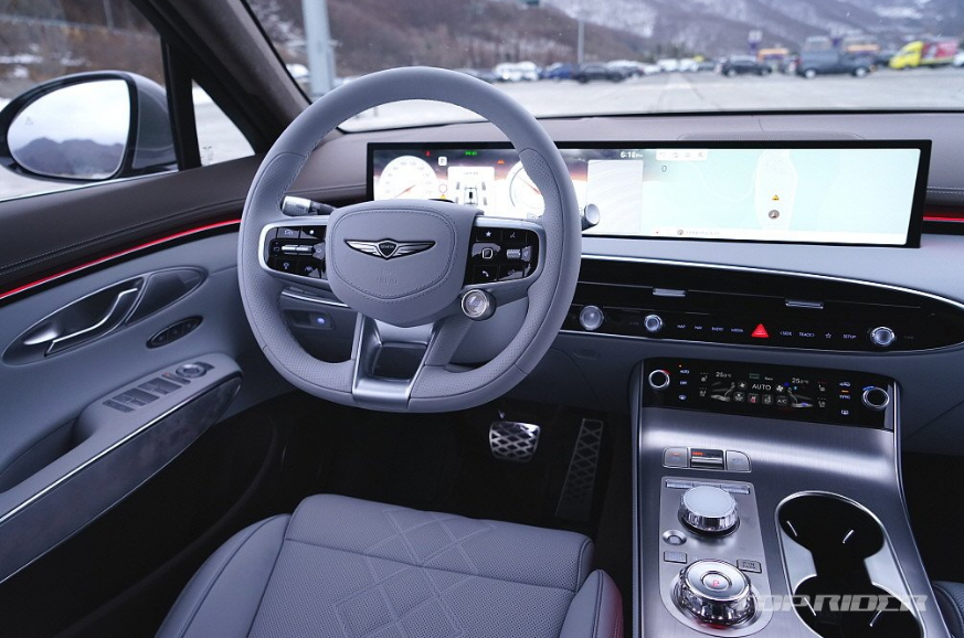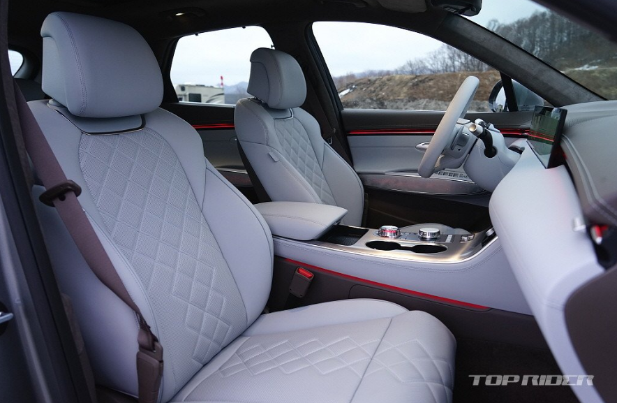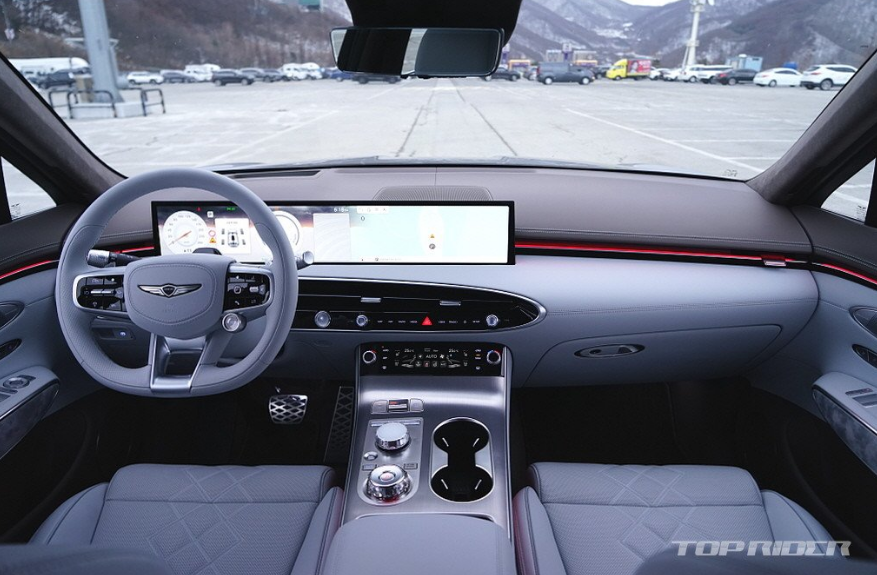 운전석은 넓은 시야와 고급차스러운 감성을 충분히 전합니다. 전기차의 재활용 소재가 주는 저렴함이 불만이라면 GV70 전동화 모델이 정답입니다. 또한 최근 출시된 X3, GLC, 마칸 전기차의 실내 고급감이 하향됐음을 고려하면 더욱 그렇습니다. 시승차는 어반 브라운/프로즌 그레이 투톤 사양입니다.