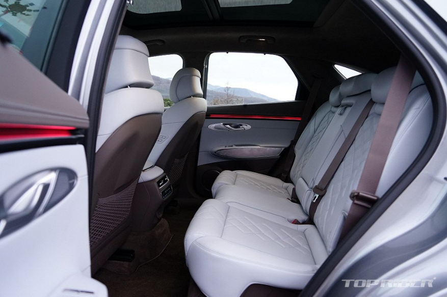정숙성은 상당히 우수한 편으로, 구동계나 공조장치의 소음도 효과적으로 억제했습니다. G80 전동화 부분변경 만큼은 아니나 동급 전기차 중에서는 우수한 편에 속합니다. 이 같은 정숙성은 고속주행에서도 이어집니다. 컴포트 모드 기준 고속주행 시 가감속과 움직임은 부드럽고 점진적인 특성입니다.