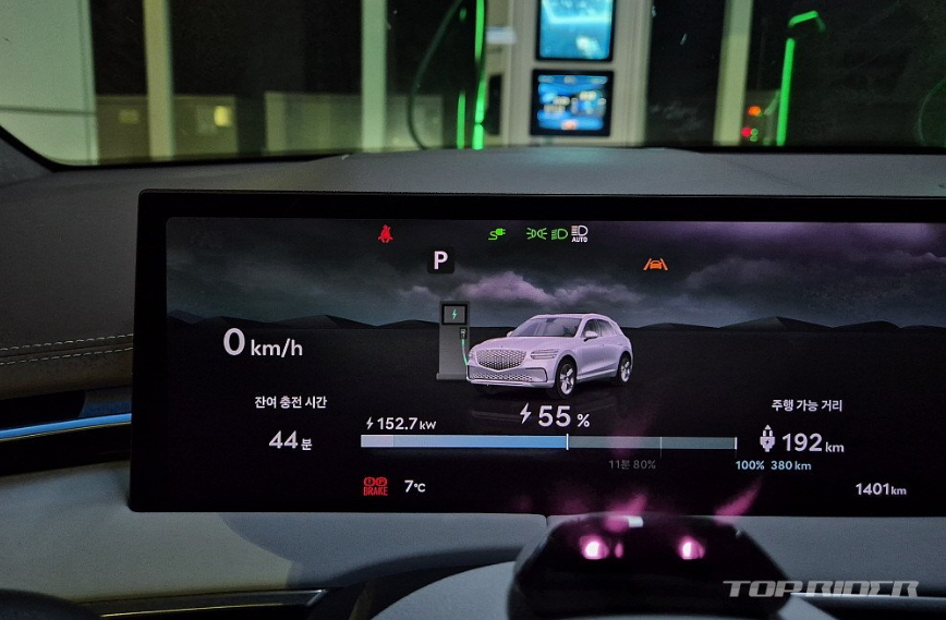충전속도는 800V 시스템을 지원해 제원상 350kW 충전기로 10→80%까지 19분입니다. 실제 속도는 외기 영상 7도 기준 200kW 충전기에서 152kW, 100kW 충전기에서 64kW 정도 나옵니다. 2024년 고성능 충전 인프라가 늘어났는데, 올해부터는 급속충전 속도가 중요한 지표가 될 전망이라고 합니다.