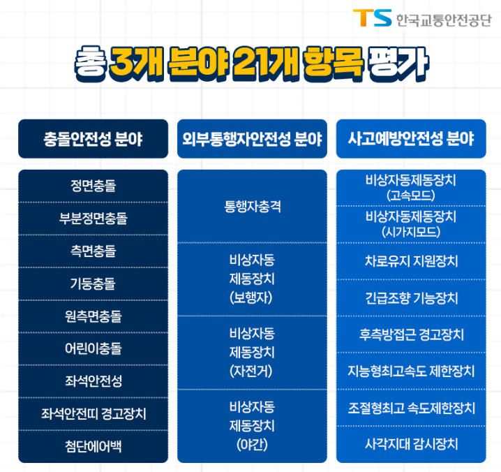 총 3개분야(충돌안전성 분야 / 외부통행자안전성 분야 / 사고예방안전성 분야)에서 21개 항목을 평가합니다.