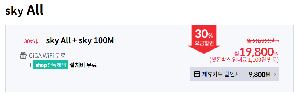 sky A 12.1(195채널) + sky 기가(200Mbps) = 월 30,800원(제휴카드 할인 시 월 10,800원)