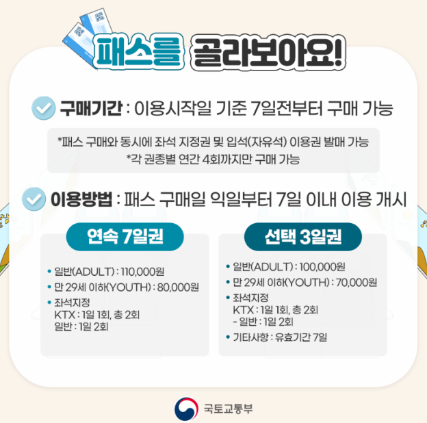 | · 일반(ADULT) : 110,000원 · 만 29세 이하(YOUTH) : 80,000원 · 좌석지정 - KTX : 1일 1회, 총 2회 - 일반 : 1일 2회 |