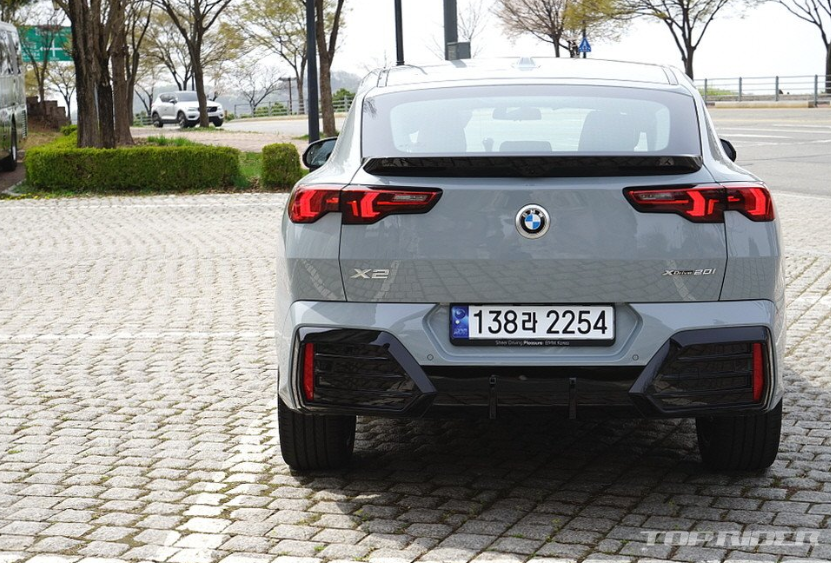 BMW X2는 기존 1세대 X2의 상품 전략을 수정해 2세대 모델을 시장이 원하는 쿠페형 SUV로 진화했습니다. 신규 플랫폼과 쿠페형 루프라인을 구현하기 위해 리어 오버행을 중심으로 전장을 195mm나 늘렸다고 합니다. 전폭 5mm, 전고 65mm, 휠베이스 20mm 등 차체는 소폭 커졌습니다.
