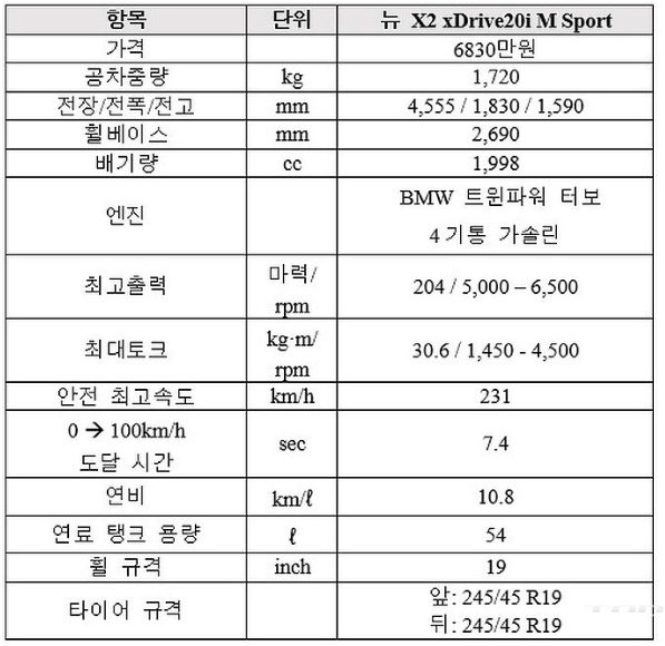 X2 xDrive20i MSP에는 2.0리터 4기통 터보엔진과 7단 듀얼클러치 변속기, xDrive 사륜구동을 통해 최고출력 204마력(5000~6500rpm), 최대토크 30.6kgm(1450~4500rpm)입니다. 공차중량 1720kg, 100km/h 가속 7.4초, 최고속도 231km/h, 연비 10.8km/ℓ(도심 9.4, 고속 13.1)입니다.