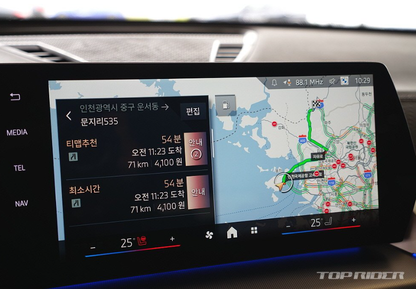먼저 그릴에 조명이 점등되는 아이코닉 글로우, 최신 LED 헤드램프, 커브드 디스플레이, 티맵 지원 헤드업 디스플레이, 전동식 트렁크, OS9과 티맵 기반 내비게이션, 최신 운전자보조, 그리고 완전자동주차를 지원하는 파킹 어시스턴트 플러스가 기본입니다. 통풍시트는 빠집니다.