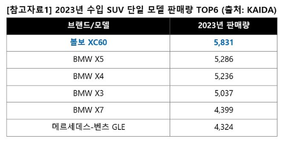 볼보의 중형 프리미엄 SUV XC60이 수입 SUV 전체 판매 1위에 올랐다고 합니다. 한국수입자동차협회(KAIDA)에 따르면 볼보 XC60은 2023년 5831대가 판매돼 BMW X3, 벤츠 GLE를 누르고 판매 1위에 올랐다고 합니다. 특히 XC60 B5는 2024년 6월 하이브리드 SUV 판매량에서 1위를 기록했습니다.