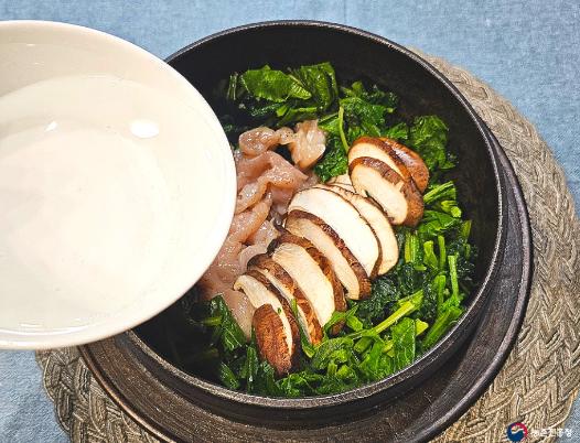 8. 돌솥 냄비에 불린 멥쌀과 찹쌀, 곤드레, 닭가슴살, 표고버섯을 넣고 물을 부어 밥을 지어줍니다.