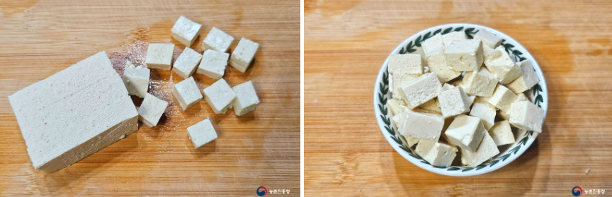 2. 두부 150g은 작은 깍둑썰기를 하고 표고버섯 1개는 슬라이스 해 줍니다. 청양고추 2개와 대파 1줄기는 송송 썰어 준비해 줍니다.